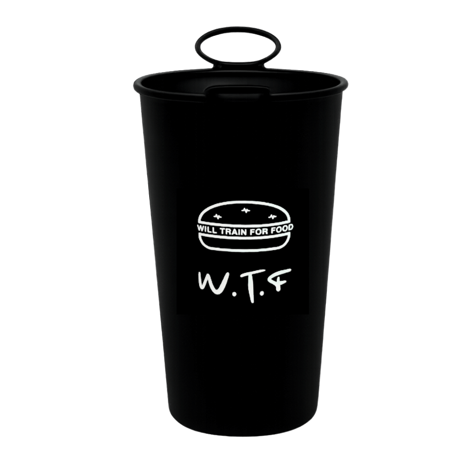 Чорний мінімалістичний дизайн з культовим написом WILL TRAIN FOR FOOD. Це більше ніж стаканчик — це меседж для тих, хто реально страждає на підйомах заради пункту з їжею 😈